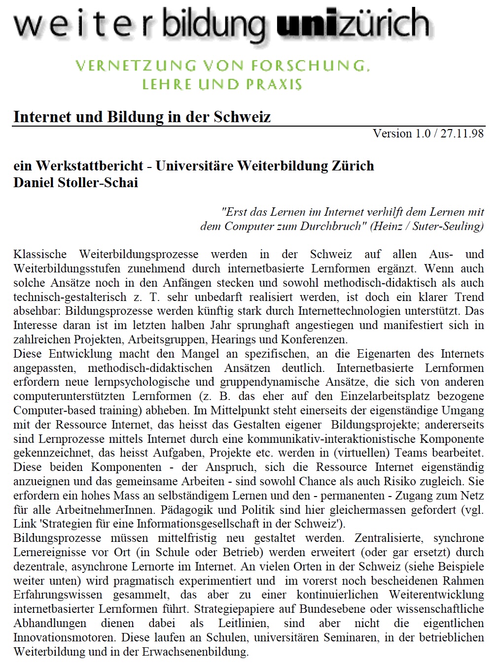 1998 - Der Text analysiert den aufkommenden Einfluss internetbasierter Lernformen auf Bildungsprozesse in der Schweiz. Anhand konkreter Praxisbeispiele – wie Studiengänge an der Universität Zürich oder das Projekt „Noisy ’98“ – wird deutlich, dass Lernen im Internet neue methodisch-didaktische Ansätze erfordert, die Eigenverantwortung und Teamarbeit fördern. Der Beitrag plädiert für eine Neugestaltung von Lernumgebungen, die technische Infrastruktur, reflexive Lernräume und Kommunikationsplattformen integrieren. Dabei betont er den Wandel von zentralisierten zu dezentralen, asynchronen Lernsettings und warnt vor sozialen Ungleichheiten beim Zugang zu digitaler Bildung.Stoller-Schai, D. (1998). Internet und Bildung in der Schweiz. Ein Werkstattbericht. Version 1.0, Universitäre Weiterbildung Zürich, 27.11.1998.