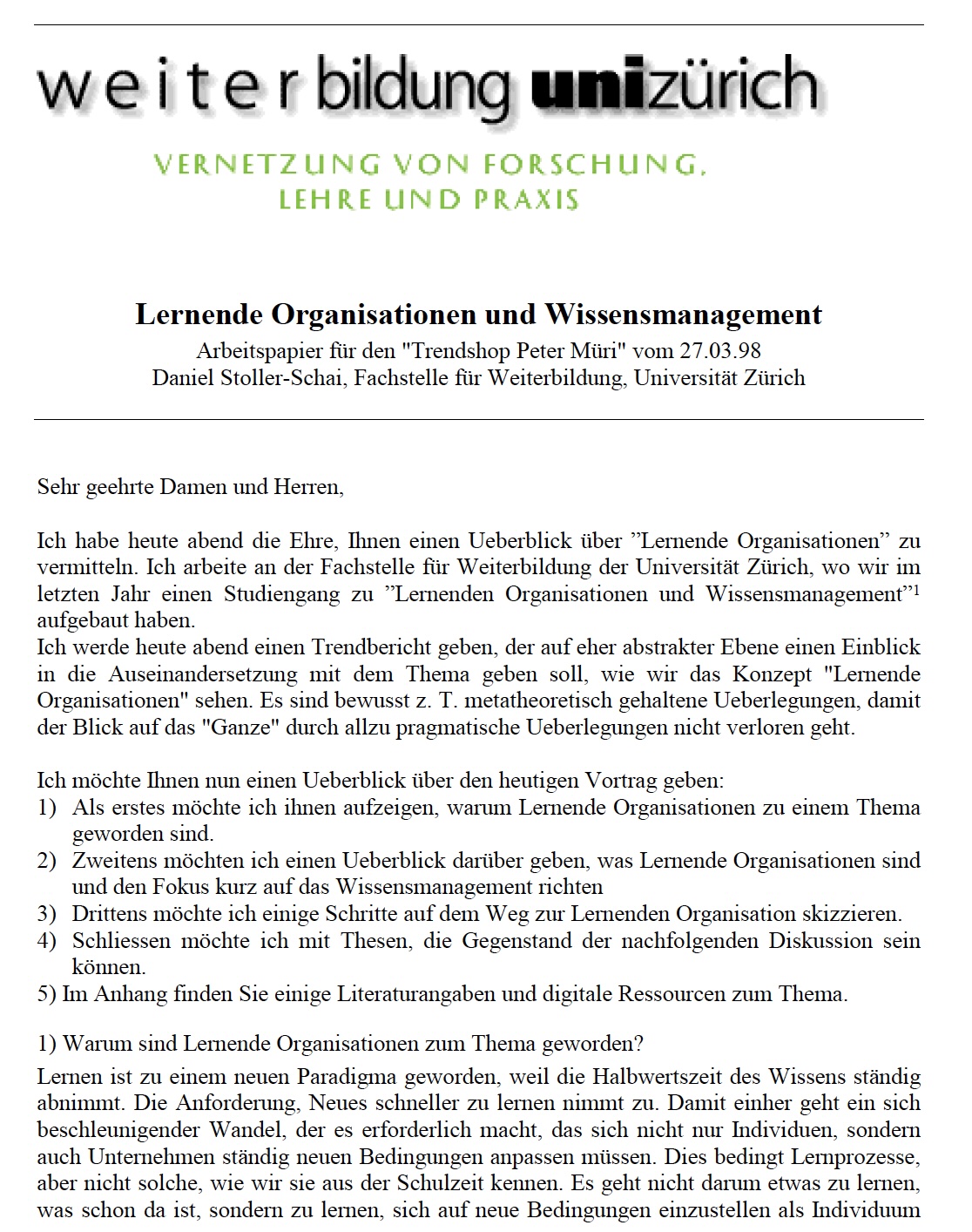 1998 - Der Text gibt einen umfassenden Überblick über das Konzept der Lernenden Organisationen im Kontext einer zunehmend komplexen, digitalisierten und dynamischen Arbeitswelt. Es werden theoretische Grundlagen, systemische Perspektiven und die Rolle des Wissensmanagements behandelt. Organisationales Lernen wird als mehrdimensionaler, emergenter Prozess verstanden, der weit über individuelles Lernen hinausgeht. Der Beitrag diskutiert praktische Schritte zur Umsetzung, benennt typische Lernhindernisse und betont die Notwendigkeit einer reflexiven, angstfreien Lernkultur. Ziel ist es, Unternehmen zu befähigen, kontinuierlich und kollektiv auf Veränderungen zu reagieren und sich selbst zu erneuern.Stoller-Schai, D. (1998). Lernende Organisationen und Wissensmanagement. Arbeitspapier für den Trendshop Peter Müri vom 27.03.1998, Fachstelle für Weiterbildung, Universität Zürich.Internetbasiertes Lernen, Digitale Lernumgebung, Selbstorganisiertes Lernen, Virtuelle Bildung, Informationsgesellschaft