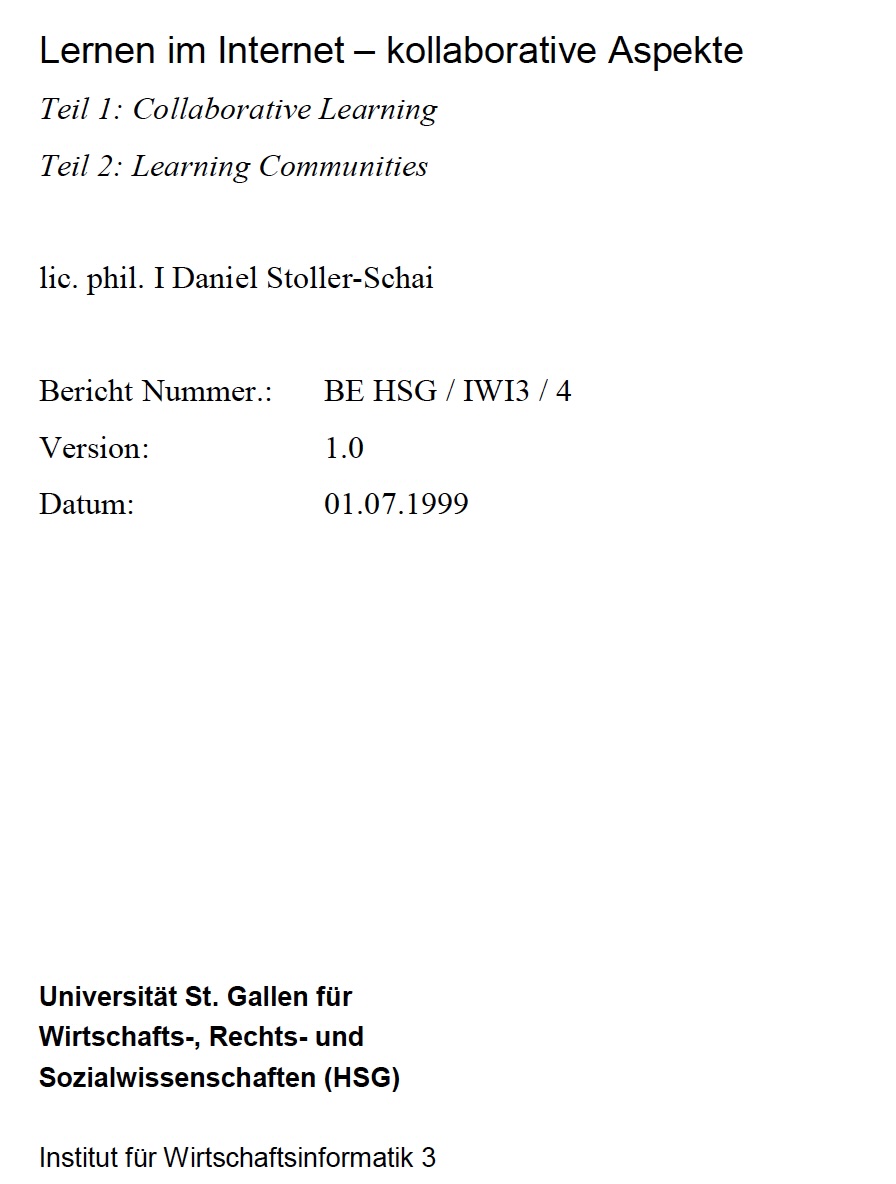 1999 - Der Arbeitsbericht analysiert die kollaborativen Aspekte internetgestützten Lernens anhand der beiden Konzepte „Collaborative Learning“ und „Learning Communities“. Es wird ein theoretischer Bezugsrahmen entwickelt, in dem Kooperation, Kollaboration, Koordination und Kompetition als eng miteinander verbundene Elemente sozialer Lernprozesse verstanden werden. Im zweiten Teil wird der Begriff der Lerngemeinschaft systematisch aufgearbeitet, mit Fokus auf informelle Bindungen, Selbststeuerung, gemeinschaftliche Reflexion und internetgestützte Formen des Lernens. Der Bericht betont die Bedeutung sozialer und kultureller Faktoren sowie geeigneter Rahmenbedingungen und Tools für erfolgreiches kollaboratives Lernen.Stoller-Schai, D. (1999). Lernen im Internet – kollaborative Aspekte. Arbeitsbericht Nr. 4, Version 1.0, Institut für Wirtschaftsinformatik 3 (IWI-HSG), Universität St. Gallen.Kooperationssoftware, Groupware, ERP-Systeme, Workflow-Management, Business Intelligence