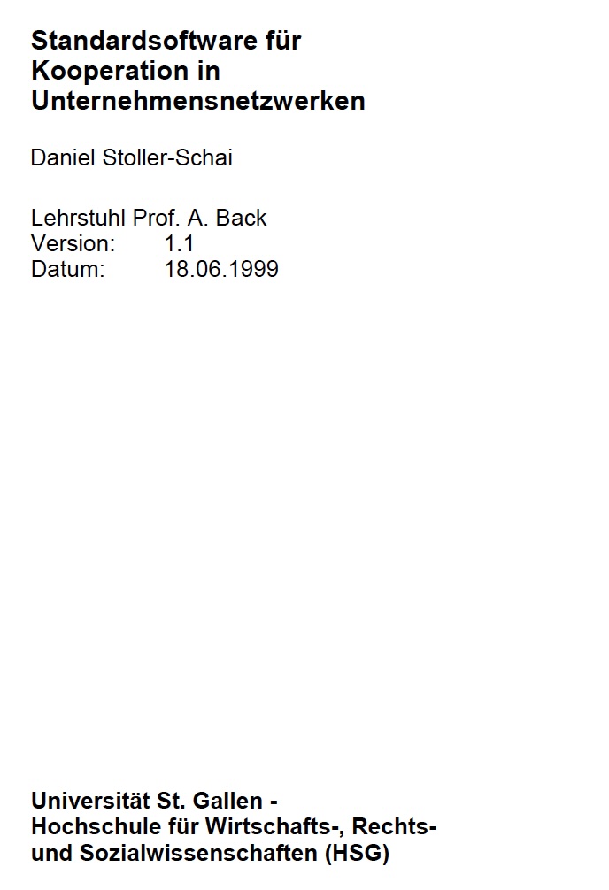1999 - Der Text bietet einen systematischen Überblick über Standardsoftware zur Unterstützung von Kooperation in Unternehmensnetzwerken. Auf zwei Organisationsebenen – Teams/Arbeitsgruppen und Organisationsbereiche – werden zentrale Softwarekategorien wie Groupware, Workflow-Management und ERP-Systeme dargestellt. Neben theoretischen Grundlagen zu CSCW, Koordination und Kommunikation werden konkrete Softwarelösungen (z. B. SAP, Baan, Peoplesoft, Oracle, J.D. Edwards) analysiert. Der Beitrag betont den Trend zu modularen, integrierten, internetbasierten Lösungen und beschreibt neue Tendenzen wie Business Intelligence und Customer Relationship Management als zukunftsweisende Erweiterungen klassischer ERP-Systeme.Stoller-Schai, D. (1999). Standardsoftware für Kooperation in Unternehmensnetzwerken. Version 1.1, Seminararbeit am Institut für Wirtschaftsinformatik, Universität St. Gallen.Lernende Organisation, Organisationales Lernen, Systemtheorie, Wissensmanagement, Lernkultur