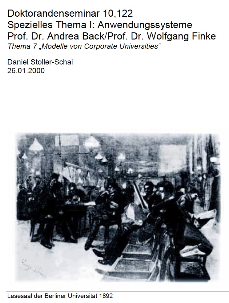 2000 - Der Text bietet eine fundierte Auseinandersetzung mit dem Konzept der Corporate University (CU) als strategisches Instrument der Personalentwicklung in Unternehmen. Analysiert werden verschiedene CU-Modelle, deren Zielkataloge, organisatorische Einbettung sowie der Einsatz internetbasierter Technologien für Lern- und Entwicklungsprozesse. CUs werden als ganzheitliche Lernarchitekturen verstanden, die die strategische Ausrichtung eines Unternehmens mit individuellen Lernpfaden verknüpfen und als Innovationsplattform für Management-, Personal- und Organisationsentwicklung dienen.Stoller-Schai, D. (2000). Modelle von Corporate Universities. Unveröffentlichtes Manuskript im Rahmen des Doktorandenseminars „Anwendungssysteme“, Wintersemester 1999/2000, Universität St. Gallen, Institut für Wirtschaftsinformatik.Kollaboratives Lernen, Learning Communities, Kooperation und Kollaboration, Internetbasiertes Lernen, Soziale Lernprozesse
