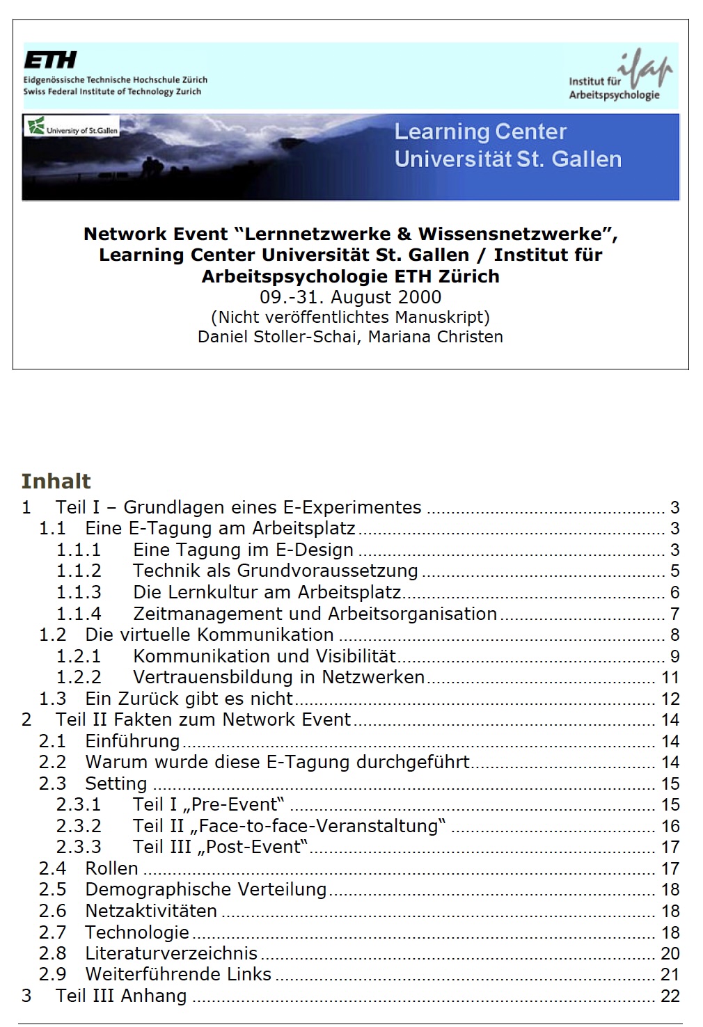 2000 - Der Text beschreibt die Durchführung und Evaluation des Network Events „Lernnetzwerke & Wissensnetzwerke“ – einer hybriden, dreiwöchigen Tagung, die virtuelle und kopräsente Lernphasen miteinander verband. Ziel war es, mit Hilfe digitaler Plattformen kollaborative Lernprozesse, Wissensaustausch und Beziehungsaufbau zwischen Fachleuten aus Wirtschaft, Wissenschaft und Bildung zu ermöglichen. Der Beitrag analysiert Chancen und Herausforderungen dieses „E-Experiments“ im Hinblick auf Technik, Lernkultur, Zeitmanagement, Kommunikation und Vertrauensbildung – und zeigt auf, wie E-Learning durch strategisch geplante Verknüpfung mit Präsenzformaten nachhaltiger gestaltet werden kann.Stoller-Schai, D. & Christen, M. (2000). Eine E-Tagung am Arbeitsplatz – Das Beispiel des Network Events „Lernnetzwerke & Wissensnetzwerke“. Unveröffentlichtes Manuskript, Learning Center Universität St. Gallen & Institut für Arbeitspsychologie ETH Zürich.Corporate University, Lernarchitektur, Strategische Personalentwicklung, E-Learning, Organisationsentwicklung