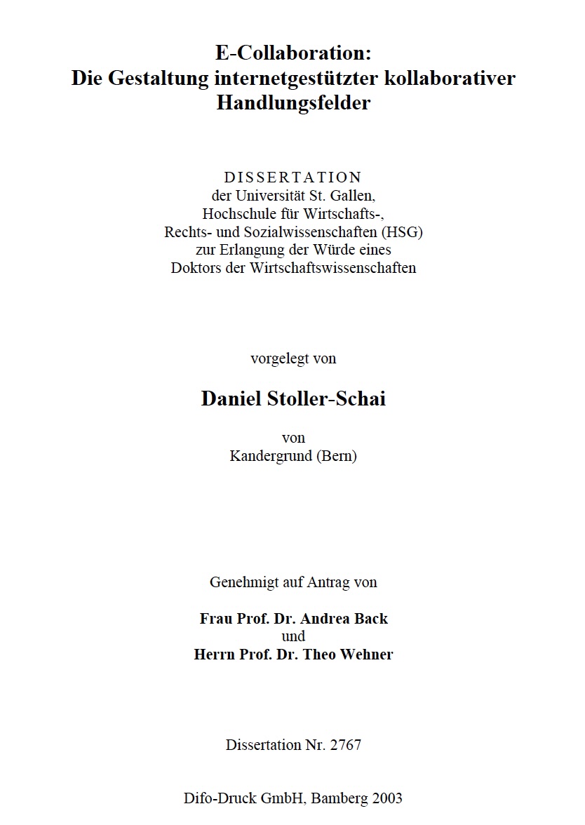 2003 - Die Dissertation entwickelt ein umfassendes Modell zur Gestaltung internetgestützter kollaborativer Handlungsfelder in Unternehmen – unter dem Begriff „E-Collaboration“. Aufbauend auf theoretischen Grundlagen, praktischen Fallstudien (u. a. mit Novartis, Credit Suisse, Hewlett-Packard) und einem multidimensionalen Gestaltungsrahmen, wird gezeigt, wie Strategien, Methoden und Technologien zusammenwirken, um hybride Lern- und Arbeitsprozesse erfolgreich zu gestalten. E-Collaboration wird dabei als integraler Bestandteil lernender, vernetzter und flexibler Organisationen verstanden, die sich in einer digitalen Wirtschaft behaupten wollen.Stoller-Schai, D. (2003). E-Collaboration: Die Gestaltung internetgestützter kollaborativer Handlungsfelder. Dissertation Nr. 2767, Universität St. Gallen, Hochschule für Wirtschafts-, Rechts- und Sozialwissenschaften. Difo-Druck GmbH, Bamberg.E-Learning, Begriffslexikon, Bildungstechnologie, Wissensmanagement, Digitale Bildung